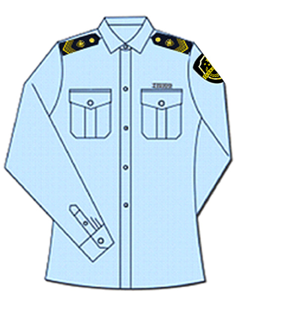說明:襯衫為滌棉混紡面料,顏色為深藍(lán)色,短袖襯衫為小翻領(lǐng),單排四粒扣,兩個(gè)明口袋。長袖襯衫為豎領(lǐng),單排五粒扣,兩個(gè)明口袋;西服簡褲或裙子為毛滌混紡面料。